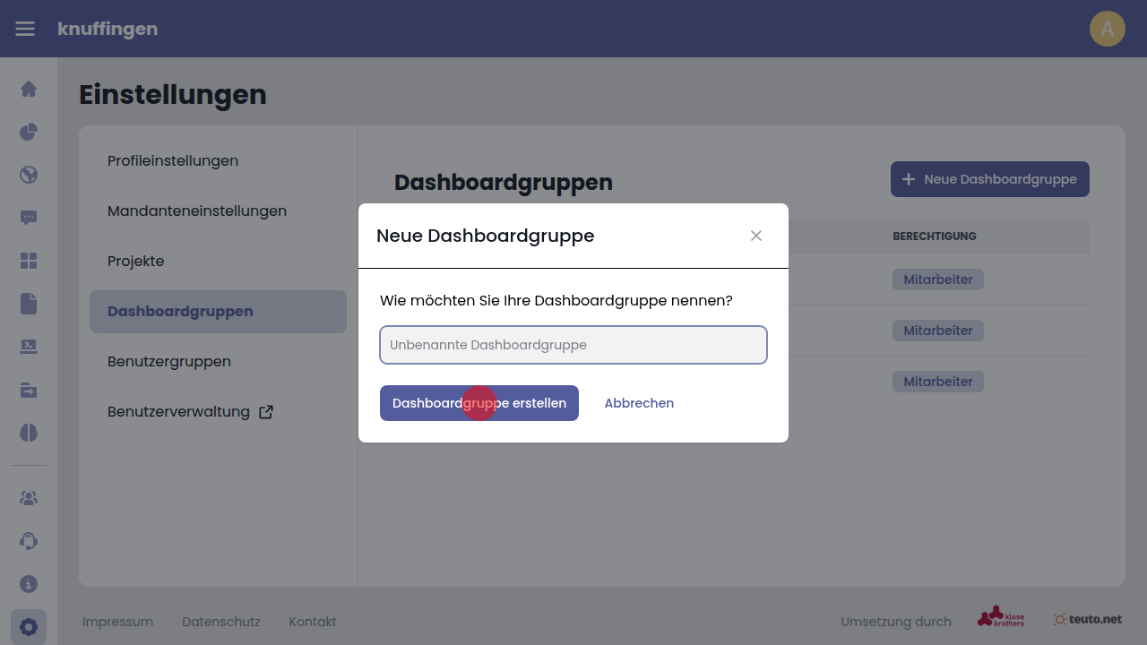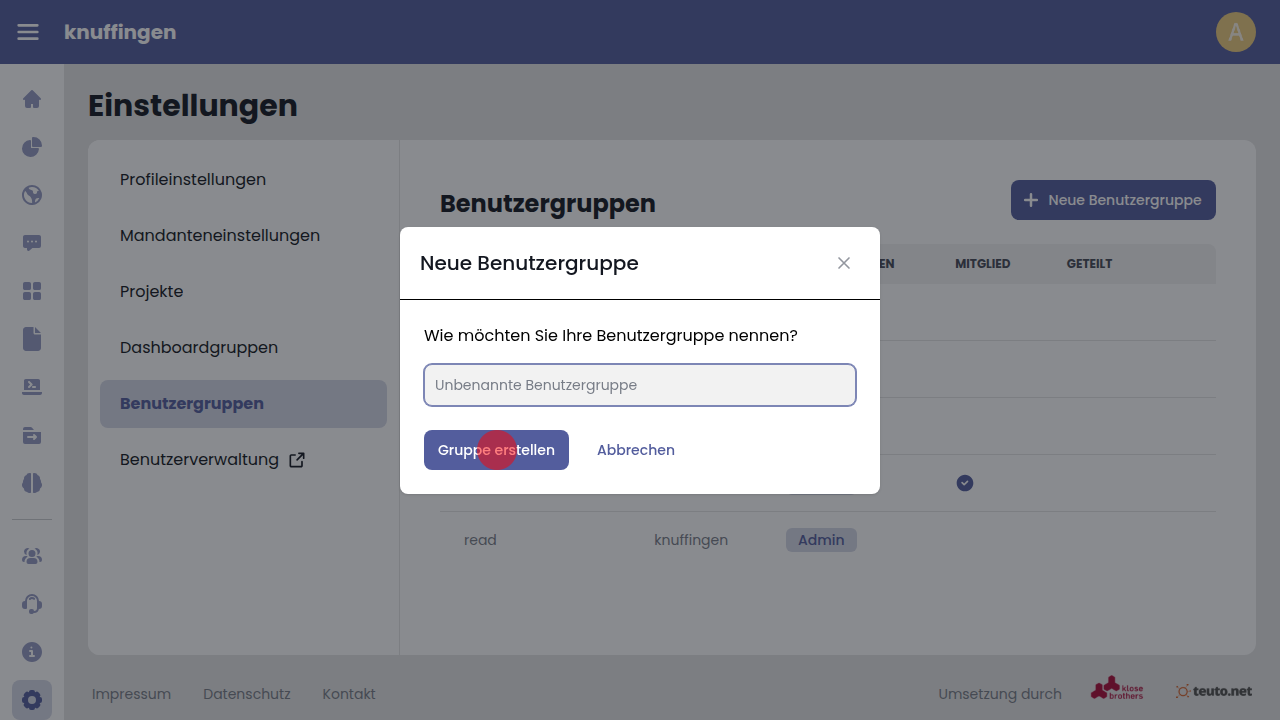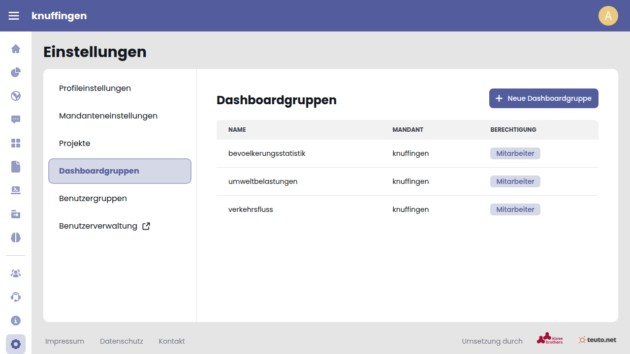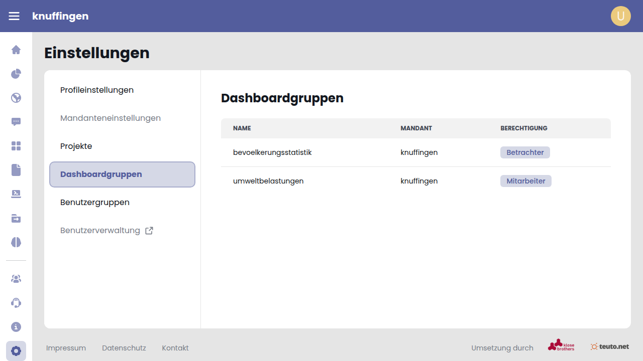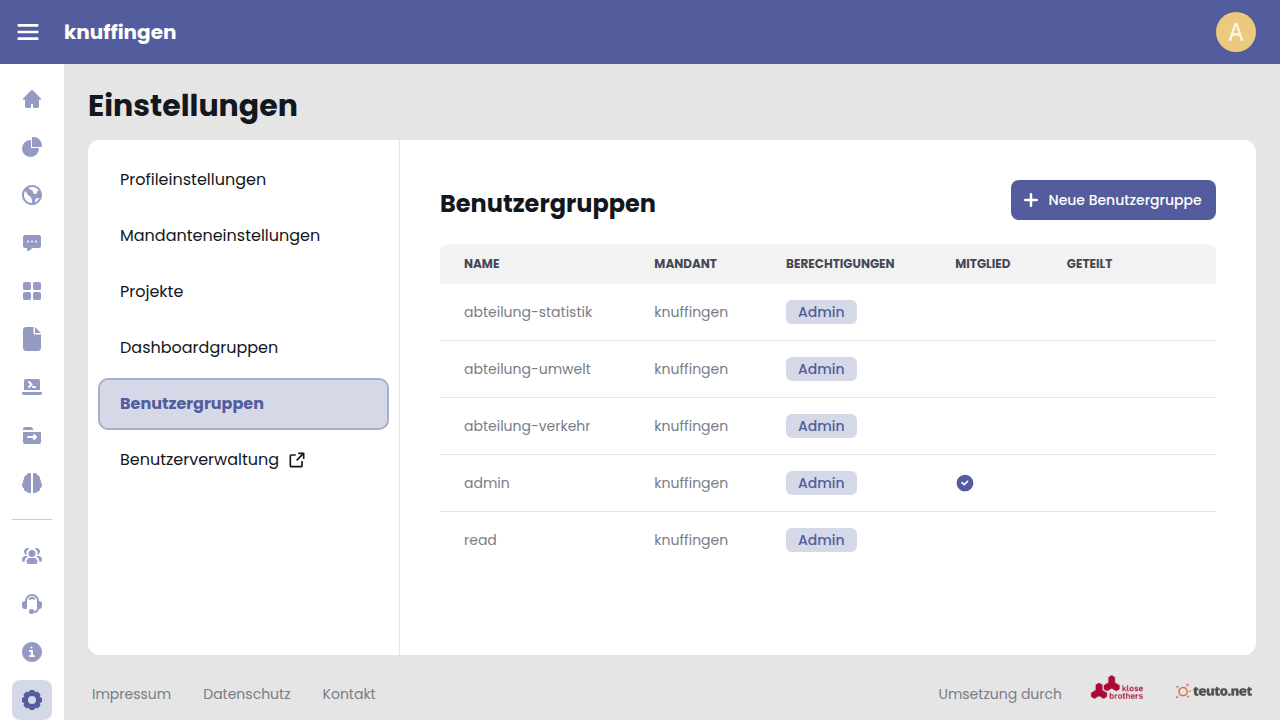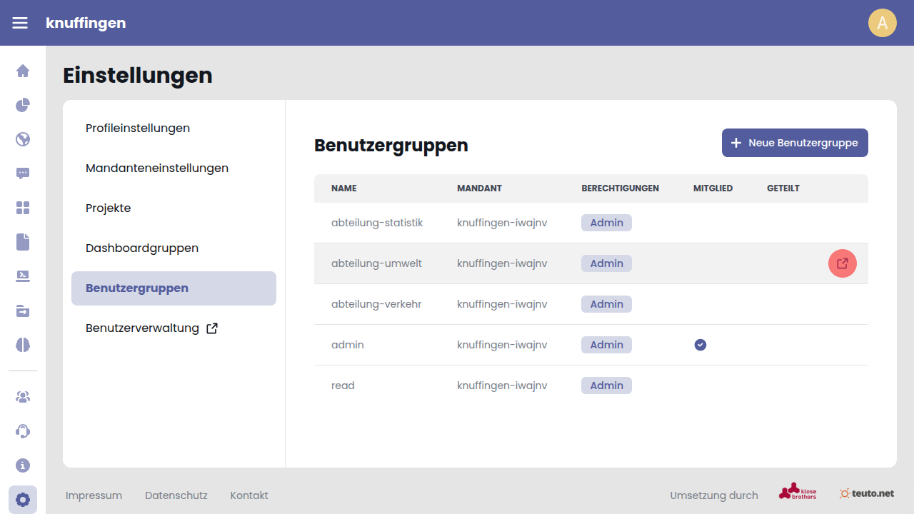 Nutzende können nur über Benutzergruppen Rechte an Dashboardgruppen und Projekten zugeordnet werden. Unter diesem Menüpunkt können mit den entsprechenden Berechtigungen Benutzergruppen erstellt, gelöscht und Berechtigungen vergeben werden. Außerdem können Benutzergruppen mit allen anderen Mandanten "geteilt" werden, sodass andere Mandanten dieser Gruppe Berechtigungen an ihren Projekten geben kann.
