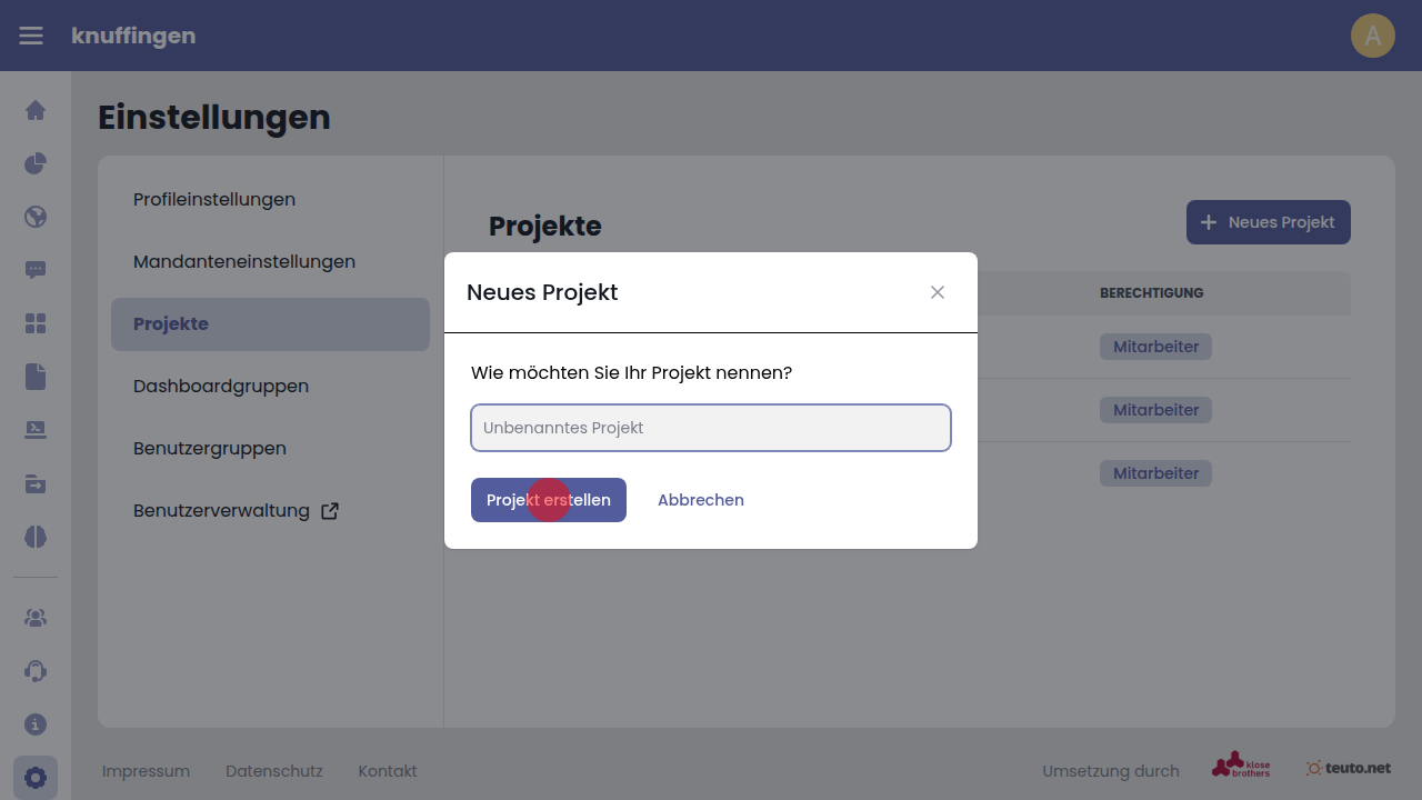 Über die Schaltfläche "Neues Projekt" kann ein neues Projekt angelegt werden, diese Aktion kann allerdings nur von einem Administratoren des Mandanten durchgeführt werden.
