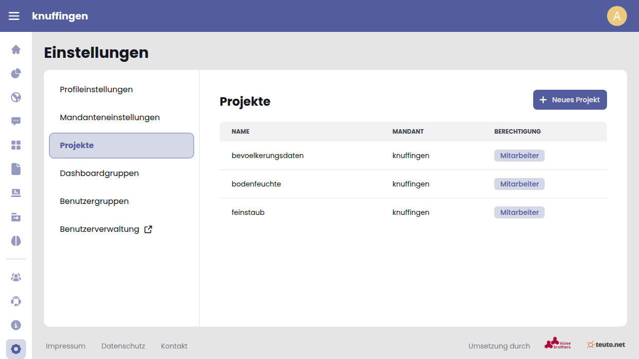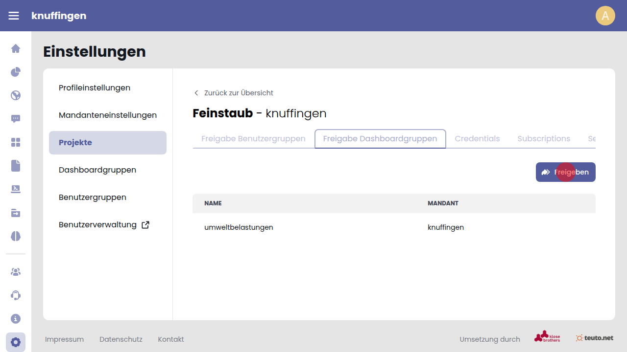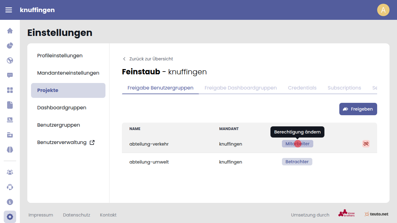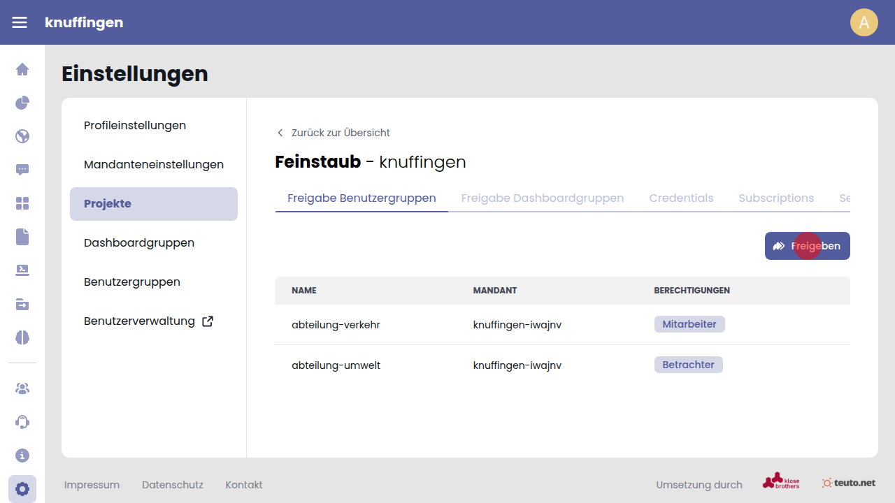- "Mitarbeiter" bedeutet Schreibzugriff auf das Projekt. Die Projekt-Detailansicht kann durch das Anklicken des Projektes aufgerufen werden, wo die Freigaben dieses Projektes an Dashboardgruppen und Benutzergruppen eingesehen und verwaltet werden können. Außerdem können Subscriptions und Credentials verwaltet werden.