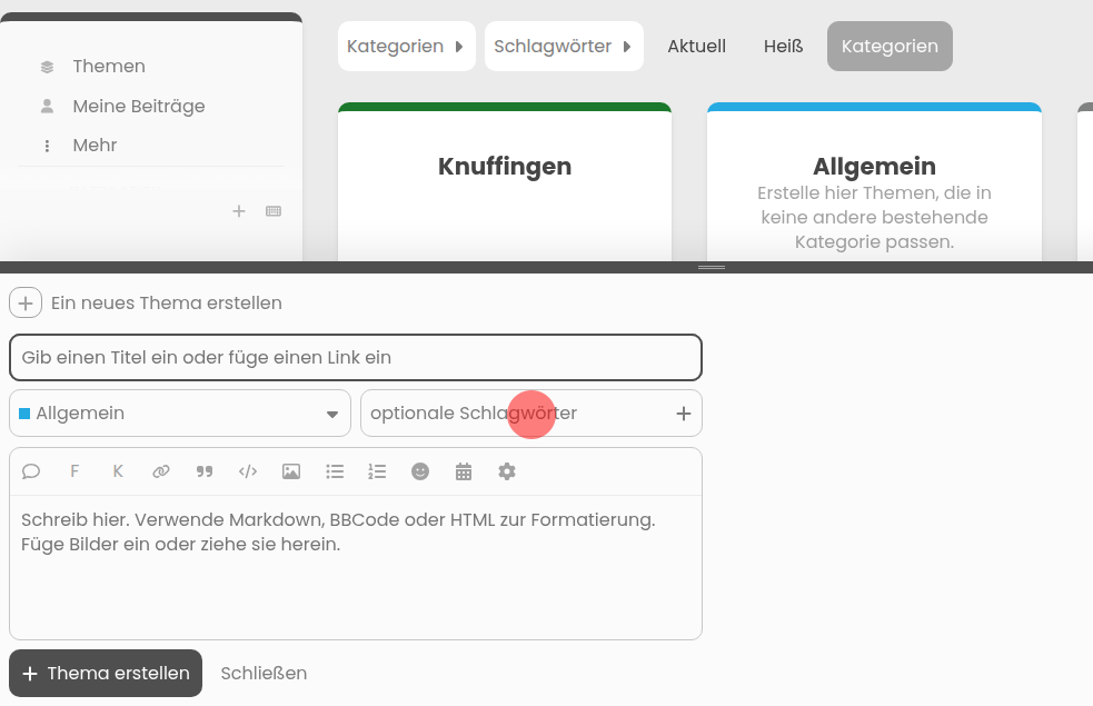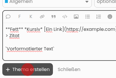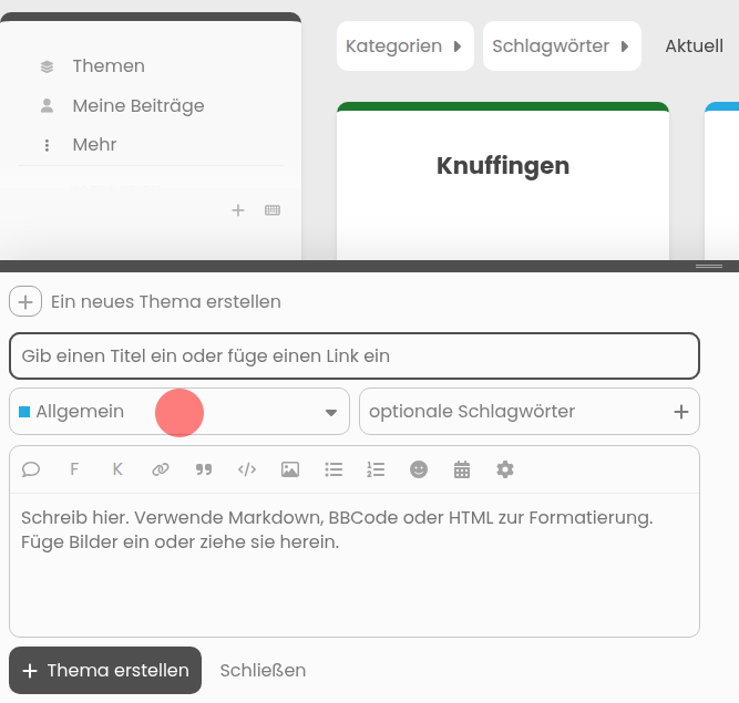 Befindet man sich bereits im Kontext einer Kategorie, wird das neue Thema in dieser Kategorie erstellt. Wird das Thema von der Hauptseite aus erstellt, muss über das Kategorie-Auswahl-Dropdown eine Kategorie ausgewählt werden.