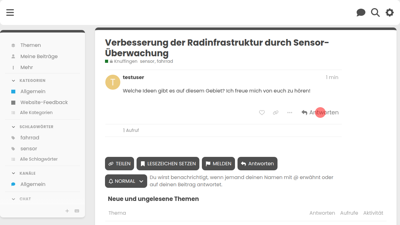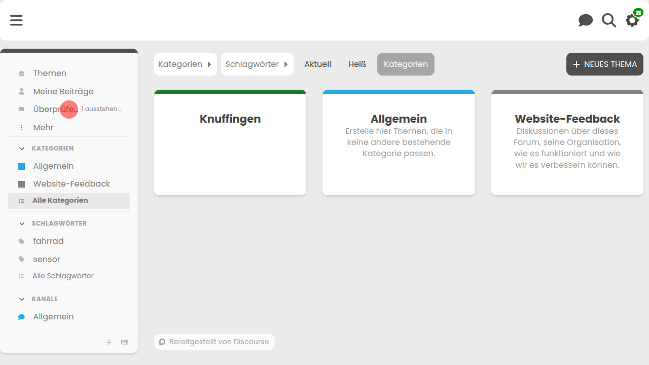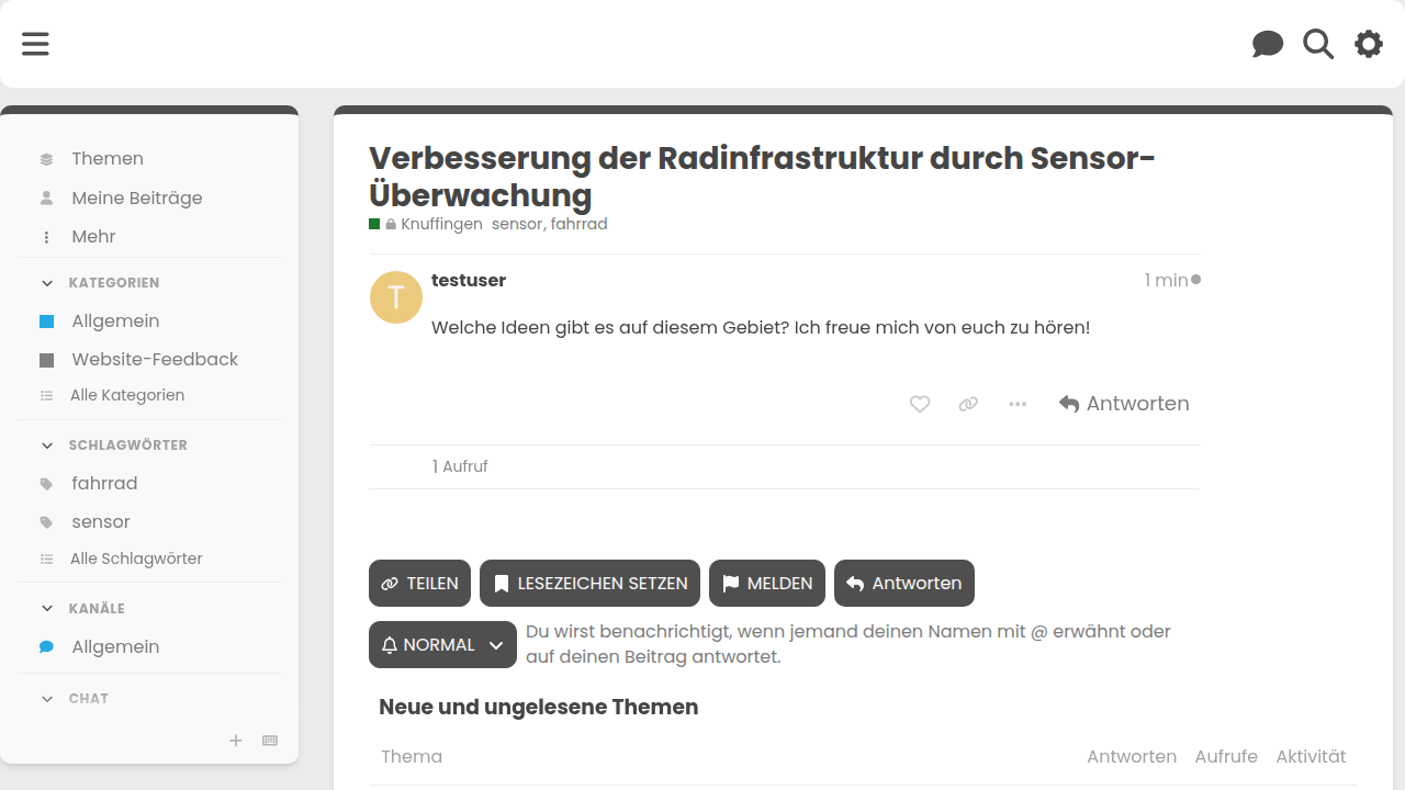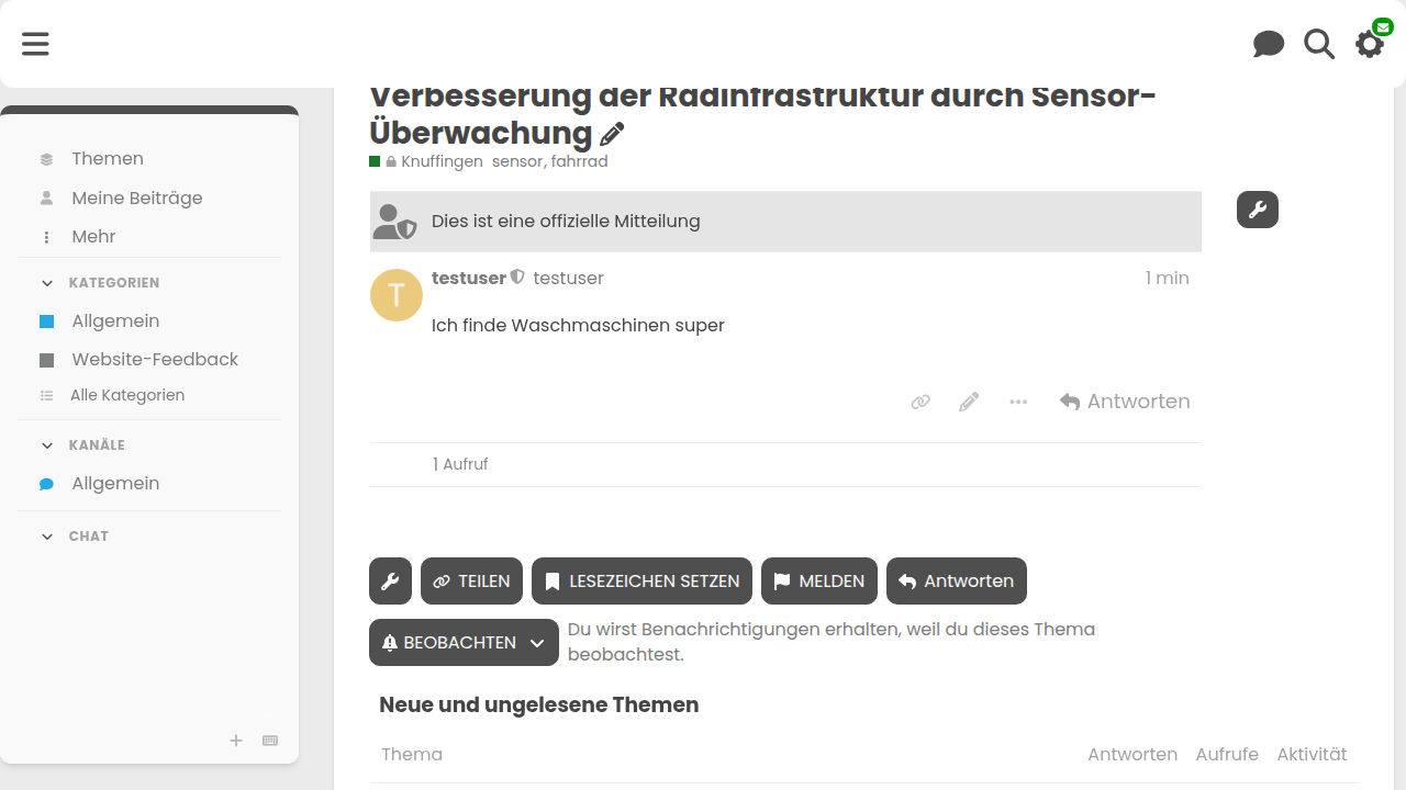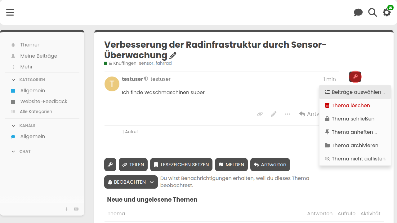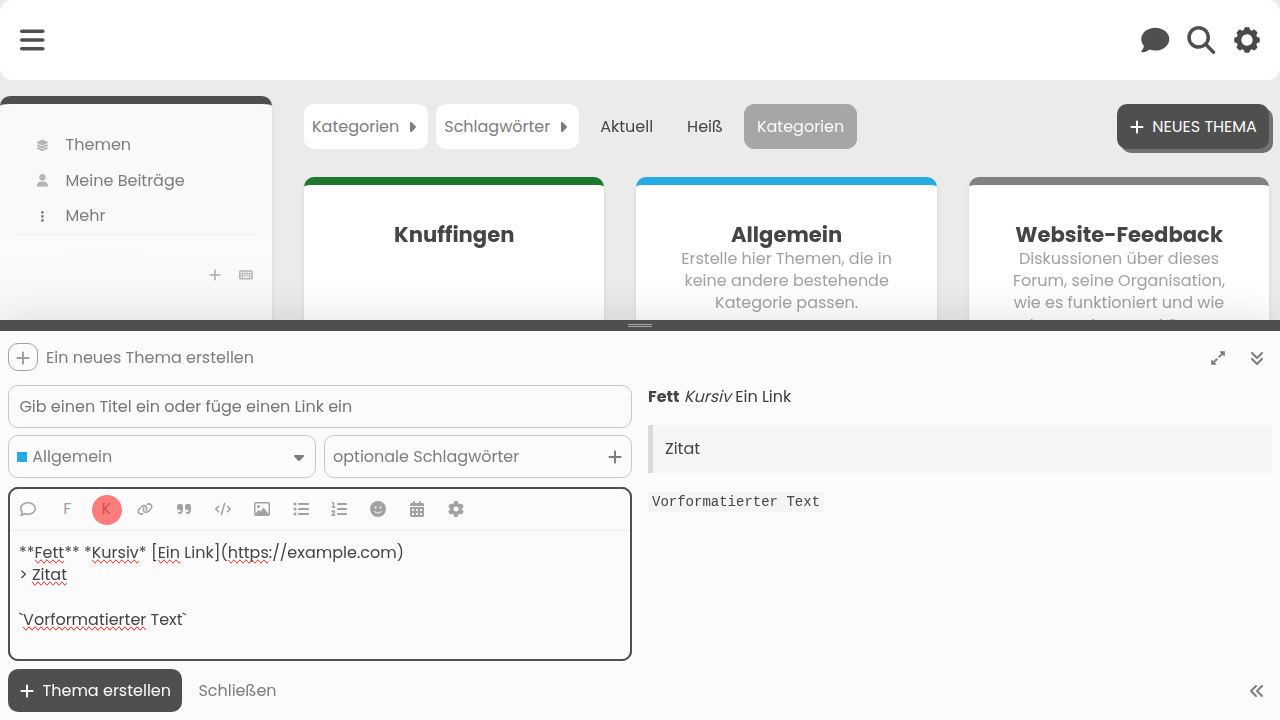 Ein Thema besteht aus einem Titel und mehreren Beiträgen. Sowohl Themen als auch Beiträge können von allen Nutzenden in Kategorien erstellt werden, die sie sehen können.