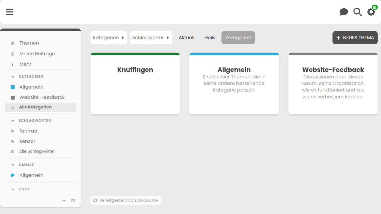 Kategorien sind die oberste Ebene in Discourse, alle Themen sind genau einer Kategorie zugeordnet. Kategorien können nur von globalen Discourse-Administratoren erstellt und gelöscht werden.