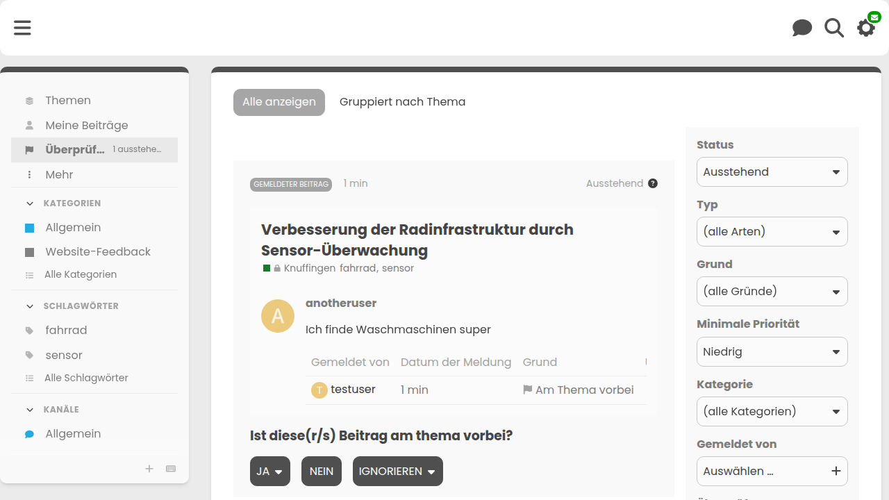 Wenn ein Benutzer einen Beitrag meldet, muss die Meldung von den Moderatoren des Mandanten bearbeitet werden. Meldungen in nicht-mandantenspezifischen Kategorien wie z.B. Allgemein können nur von globalen Discourse-Administratoren bearbeitet werden.