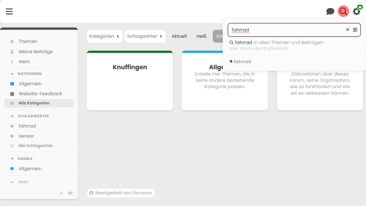 Um im Community-Forum zu suchen, kann die Suchfunktion durch das Drücken des Lupen-Icons oben rechts verwendet werden.