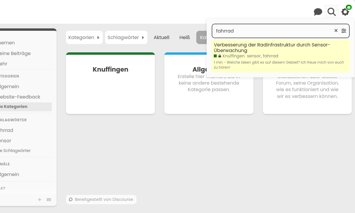 Discourse ist die zentrale Chat- und Diskussionskomponente für die Community des Urbanstacks. Die Anwendung kann eingebettet über den Gov Hub aufgerufen werden: