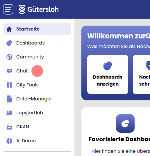 Um Direktnachrichten an andere Teilnehmende des Forums zu senden, kann der Menüpunkt "Chat" im Gov Hub genutzt werden. Dadurch wird der Chat im Vollbildmodus angezeigt.