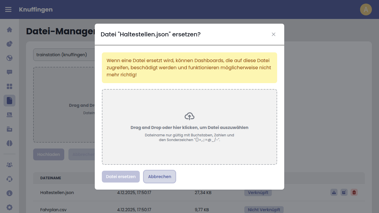Um eine Datei zu ersetzen, die verknüpft ist, muss der Knopf zum Bearbeiten der jeweiligen Tabellenzeile genutzt werden. Dabei muss die neue Datei exakt den gleichen Dateinamen haben.