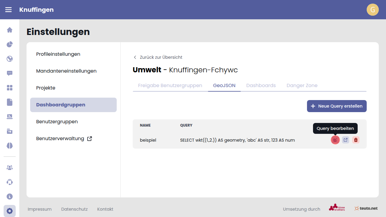 Abfragen können in der Detailansicht für Dashboardgruppen im Reiter "GeoJson" verwaltet werden, dies ist nur Personen mit der Berechtigung "Mitarbeiter" auf der Dashboardgruppe möglich.